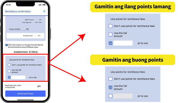 ・Maaari mong gamitin ang iyong points sa internet o mobile remittance.